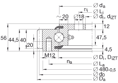 ![]() ![]() ![]() ![]() ![]() ![]() ![]() ![]() ![]() ![]() | Type: INA Slewing rings di 304 Tolerance: +0,5 Da 503,3 Di 415,5 Tolerance: +0,5 Di ZT 417 Valid for bearings with centring (suffix ZT) Centring lengths (T, t) (see dimension drawing) Tolerance: +IT8 d0 495 da 412,5 Tolerance: -0,5 di ZT 306 Valid for bearings with centring (suffix ZT) Centring lengths (T, t) (see dimension drawing) Tolerance: +IT8 H 56 La 455 Li 332 m 5 Tooth modulus na 10 Number of fixing holes in outer ring ni 12 Number of fixing holes in inner ring z 99 Number of teeth m 29,5 Mass Fr per 41300 Maximum permissible radial load against friction lock Fz norm 15900 Maximum permissible tooth force (dedendum fatigue strength) Fz max 23600 Max. permissible tooth force against tooth fracture in dedendum Ca 169000 Basic dynamic load rating, axial C0a 295000 Basic static load rating, axial Cr 111000 Basic dynamic load rating, radial C0r 110000 Basic static load rating, radial 4 taper type lubrication nipples, DIN 71412-A S8x1, spaced uniformly on circumference Bearings are also available without holes in the bearing rings. |